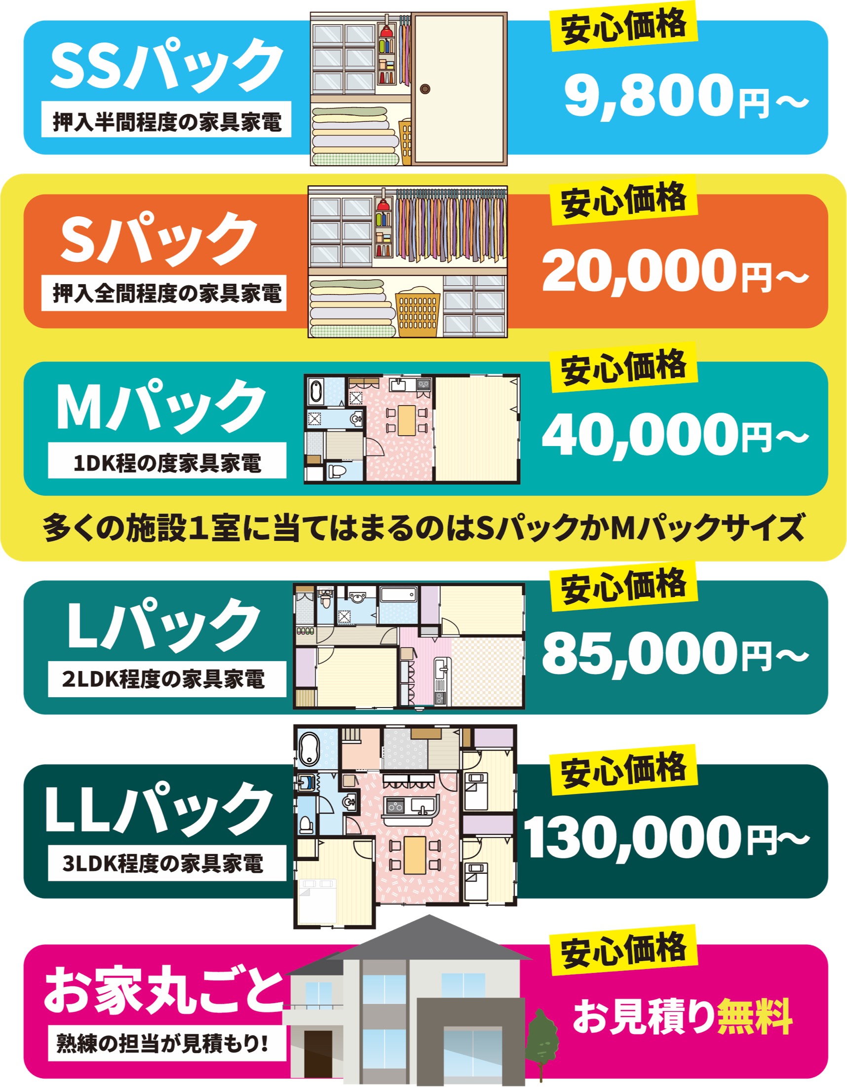 明確な不用品回収定額パック料金と事前の詳しい聞き取りをもとに、見積金額を確定させてから伺います。当日追加料金が発生することはありませんので初めての方でも安心してご利用いただけます。