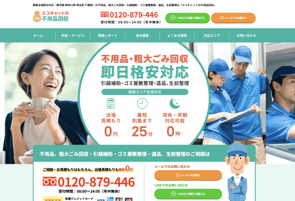 市川市を含む関東エリア対応の不用品回収・片付け業者で、一軒丸ごと対応・当日対応も可能とする訴求があります。 -