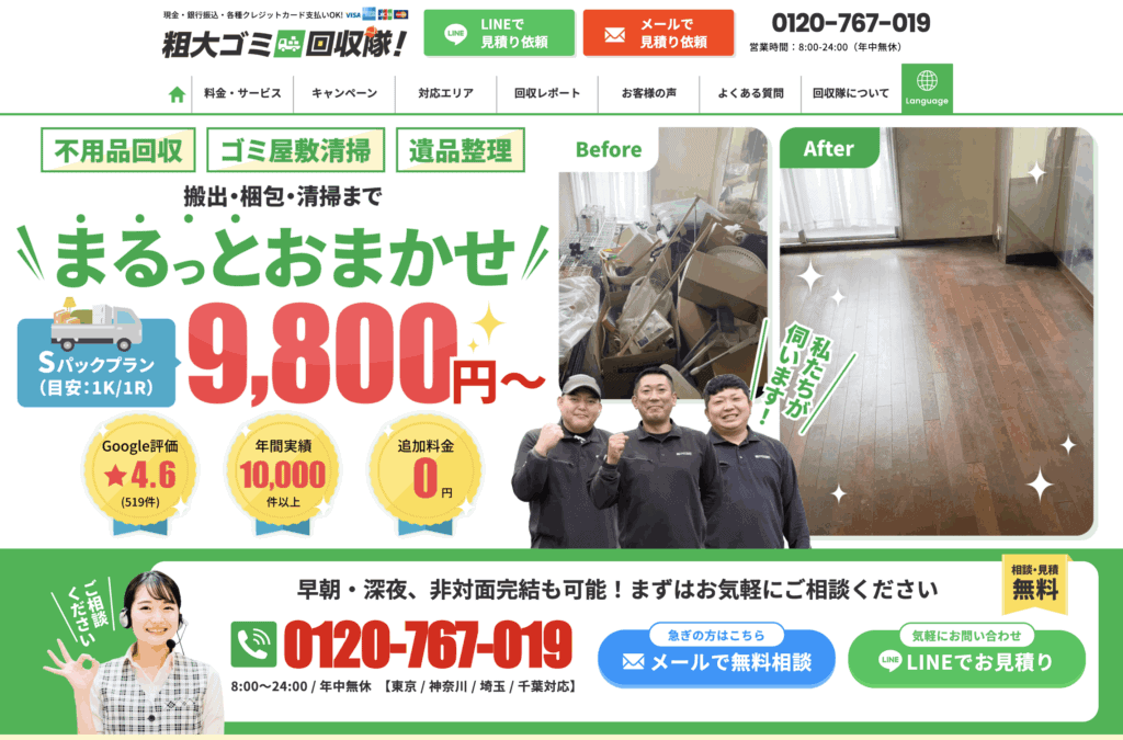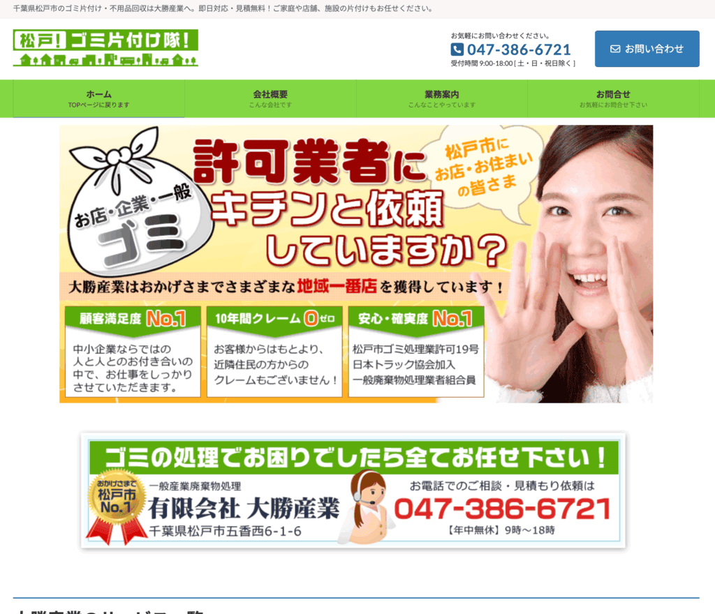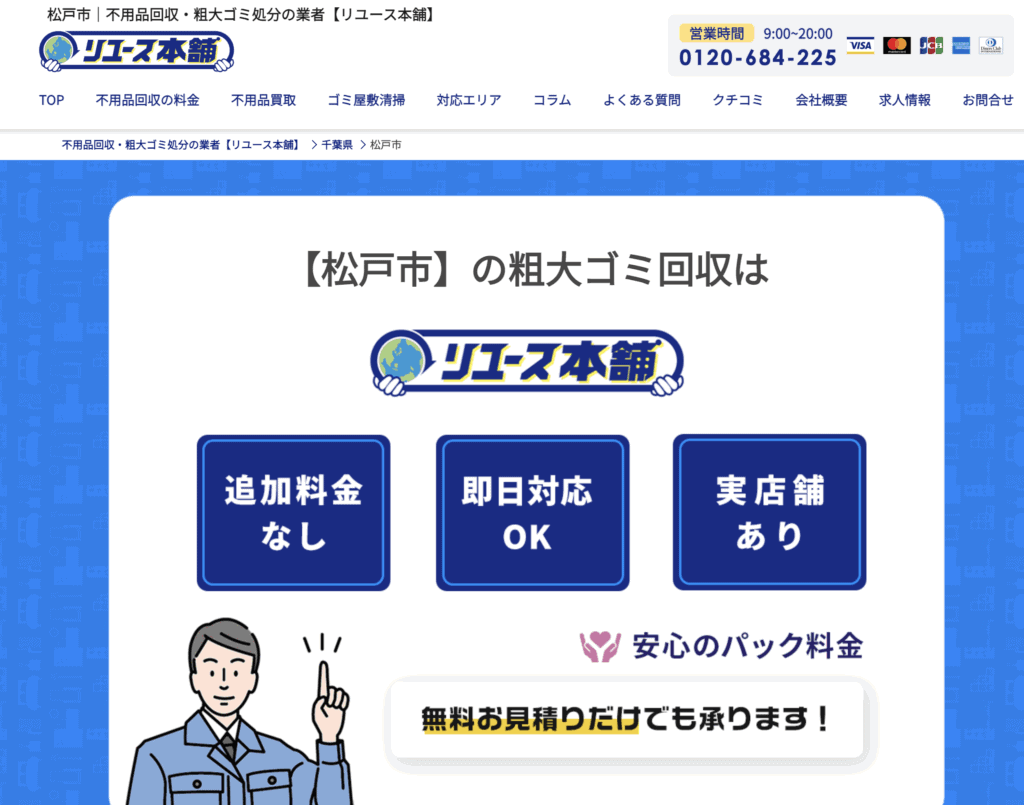 市川市もサービスエリアとして掲げており、「どんなものでもスピーディーに対応」との訴求で、急ぎの片付けに対応可。 -
